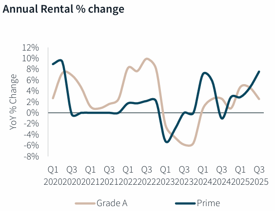 现开罗市2025年Q3季度市场总存量为250万平方米;预计在Q4季度将新增173,200平米;整体空置率为9.0%;整体市场平均租金为核心区域顶级楼宇达到了人民币 271元 /平方米/月,年同比增长7.6%;Grade A级楼宇达到了人民币 197元 /平方米/月,年同比增长2.5%。基于这一最新数据,目前埃及开罗核心区域顶级写字楼平均租金已经达到中国国内一线城市CBD水平。