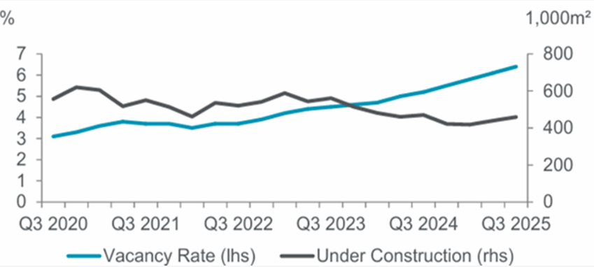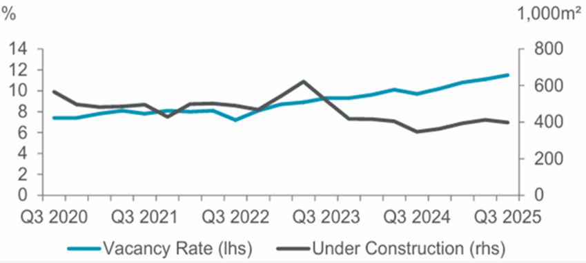 前三季度总吸纳量为 308,900平方米, 相较于2024年同时期增长4%,但相较于近5年的平均水平下降10%,Q3单季度吸纳量为96,000平方米;