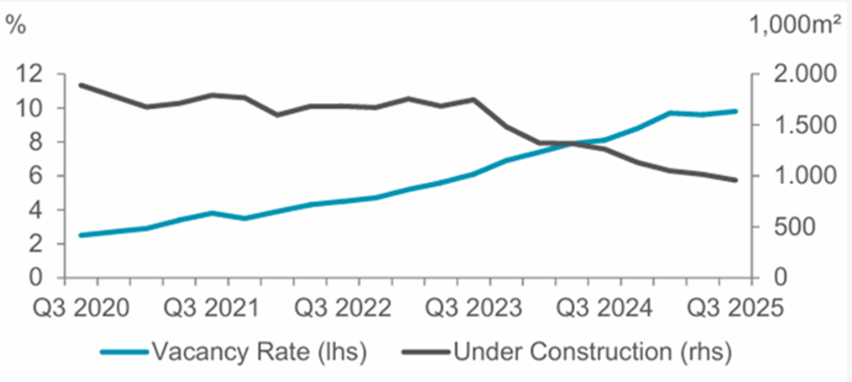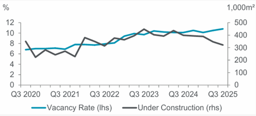 整体空置率为10.8%,市场空置总面积为1,010,000平方米,相较于Q2季度增长了0.3%,年度同比增长0.7%;