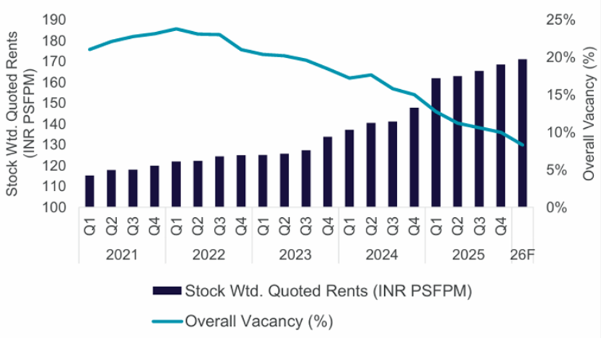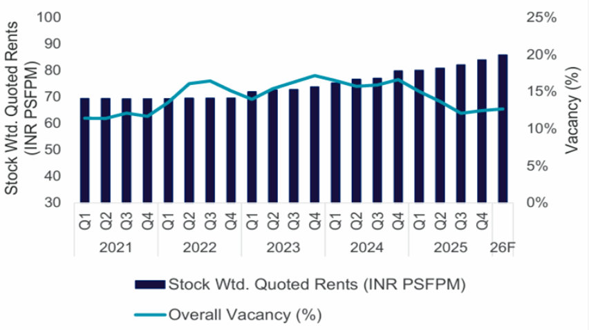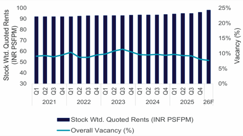 2025年第四季度,班加罗尔地区强劲的需求导致办公楼租金在季度和年度上都出现增长。预计在近期内,租金可能会进一步上升,这主要受新建甲级/超甲级写字楼在核心区域市场中交易活跃的推动。
